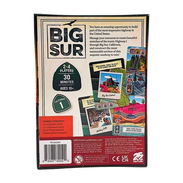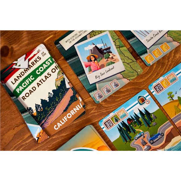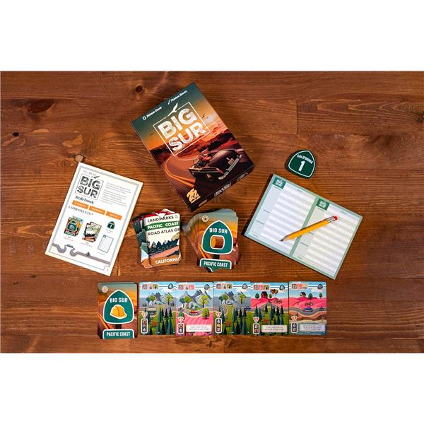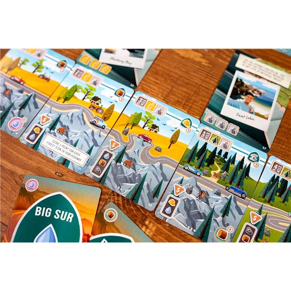 In Big Sur, players draft cards to use them either as resources to build new road sections or as the road sections themselves. Your linear path of cards will score for connecting terrain types and meeting other conditions. You can also add notable landmarks to your highway for other unique scoring conditions; these landmarks are based on actual scenic lookouts and locations on Big Sur.