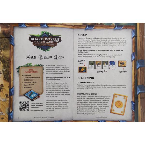 BOARD ROYALE is a turn-based survival card game for 2 to 6 players. To survive, you will have to be sneaky and a ruthless backstabber. BEWARE: Board Royale can be a friendship breaker! The goal of the game is to survive by any means necessary. If a player runs out of resources, they are instantly eliminated from the game! The last man standing on the island or the first to escape by collecting 10 escape points, wins the game. This is not an easy task!