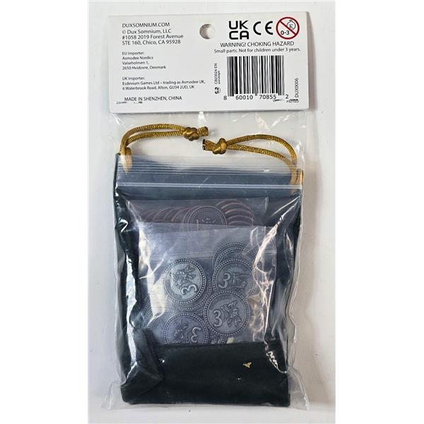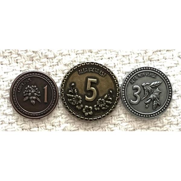 A set of metal coins to replace the cardboard, offered as an add-on in the original Kickstarter campaign.
