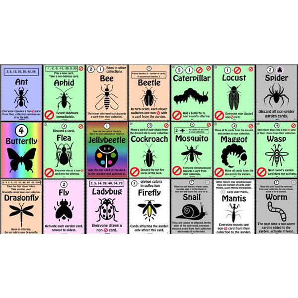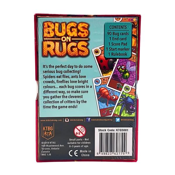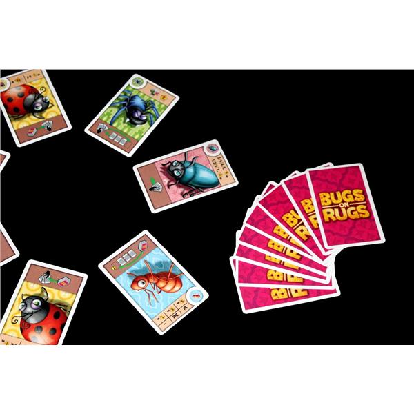 In Bugs on Rugs, players take turns drafting bug cards to their hand to make sets. At the end of the game players reveal their bug collections. The player who has made the most valuable hand of creepy crawlers WINS!