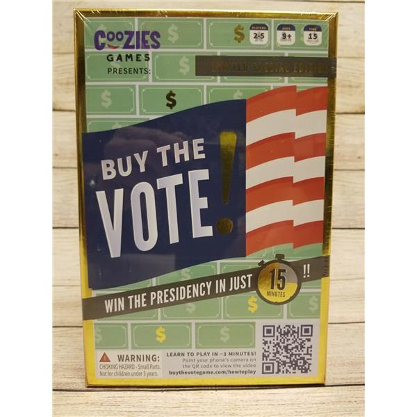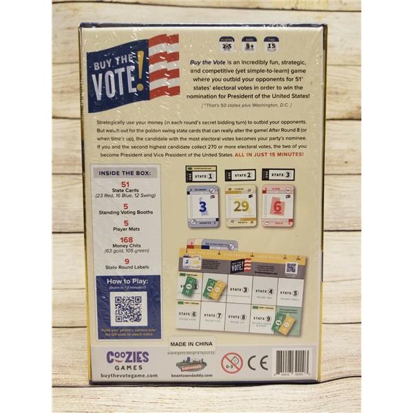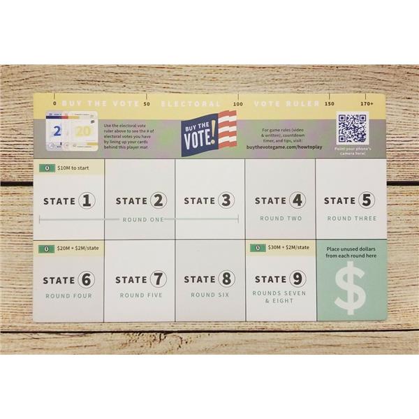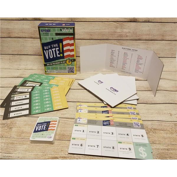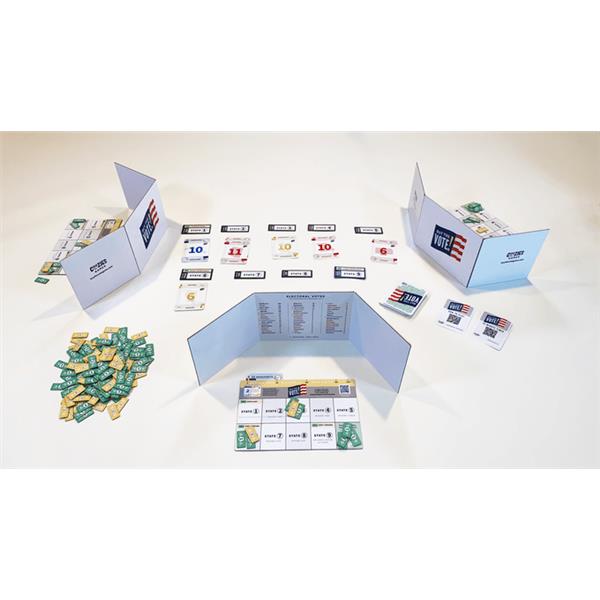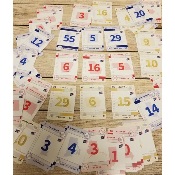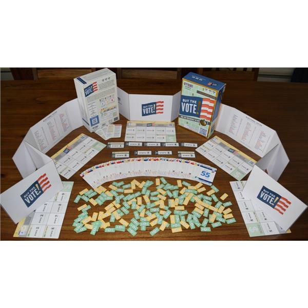 Buy the Vote is a 15 minute blind bidding game where candidates win states by spending the most campaign dollars. Players are presidential candidates running for president with the goal of collecting as many electoral votes as possible. At the end of the game, the player with the most electoral votes becomes the presidential nominee and the player with the second most electoral votes become the running mate; together the presidential nominee and the running mate need 270 electoral votes to win the Presidency!