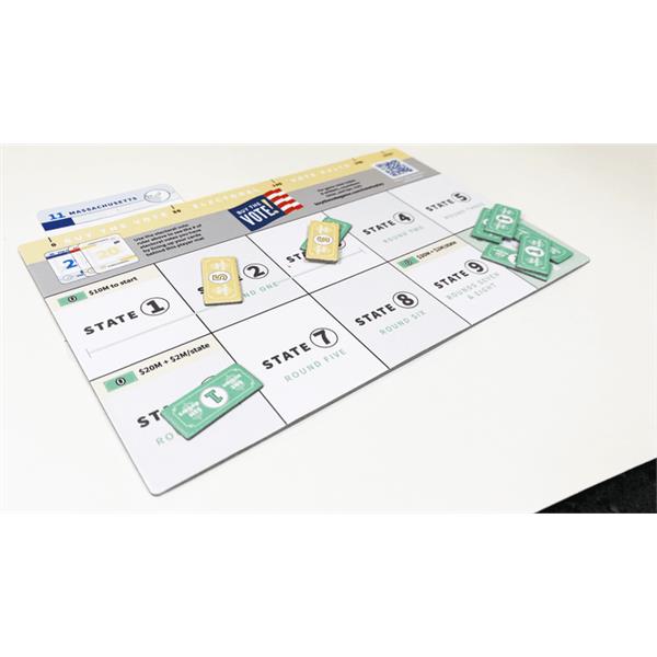 To campaign for states, players will select states to spend their campaign dollars on behind voting booths, and when ready, all bets are revealed. The player that spends the most campaign dollars the state wins the state's electoral votes. Once that money is spent, win, tie, or lose; that money is gone. Big advertising networks thank you for your campaign dollars.