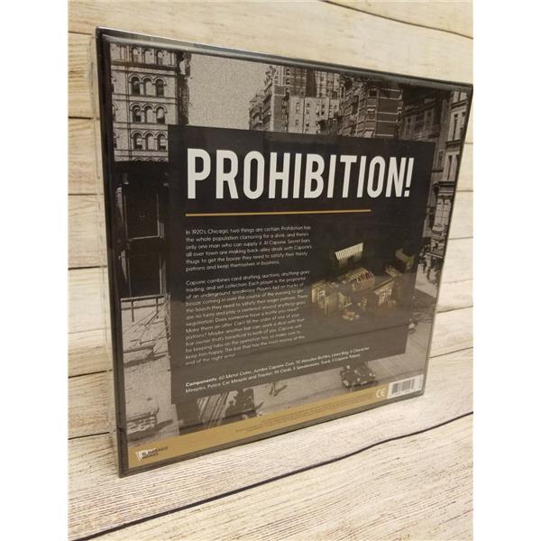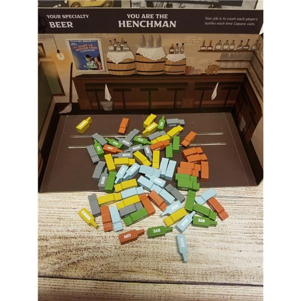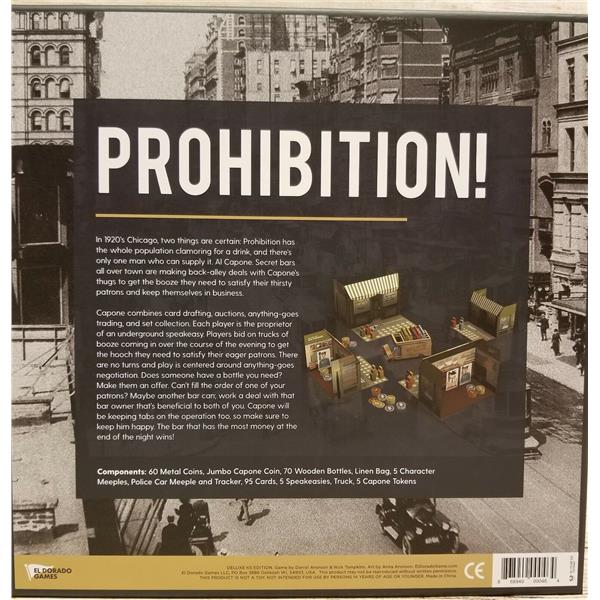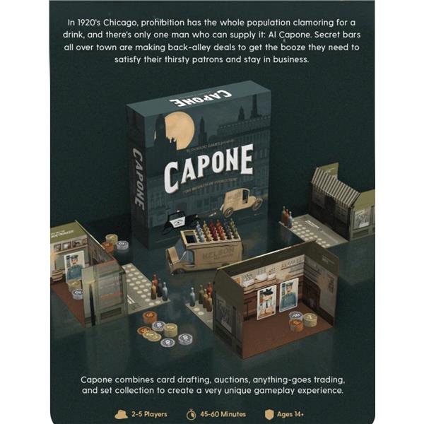 Capone combines card drafting, auctions, anything-goes trading, and set collection. Each player is the proprietor of an underground speakeasy. Players bid on trucks of booze coming in over the course of the evening to get the hooch they need to satisfy their eager patrons. There are no turns and play is centered around anything-goes negotiation. Does someone have a bottle you need? Make them an offer. Can't fill the order of one of your patrons? Maybe another bar can; work a deal with that bar owner that's beneficial to both of you. Capone will be keeping tabs on the operation too, so make sure to keep him happy. The bar that has the most money at the end of the night wins!