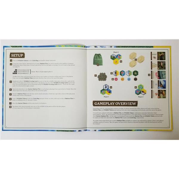 Ideally you can place habitat tiles to create matching terrain that reduces fragmentation and creates wildlife corridors, mostly because you score for the largest area of each type of habitat at game's end, with a bonus if your group is larger than each other player's. At the same time, you want to place wildlife tokens so that you can maximize the number of points scored by them, with the wildlife goals being determined at random by one of the three scoring cards for each type of wildlife. Maybe hawks want to be separate from other hawks, while foxes want lots of different animals surrounding them and bears want to be in pairs. Can you make it happen?