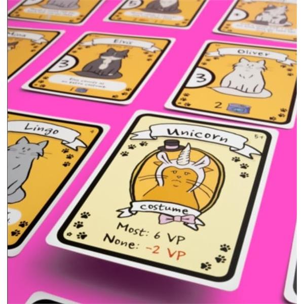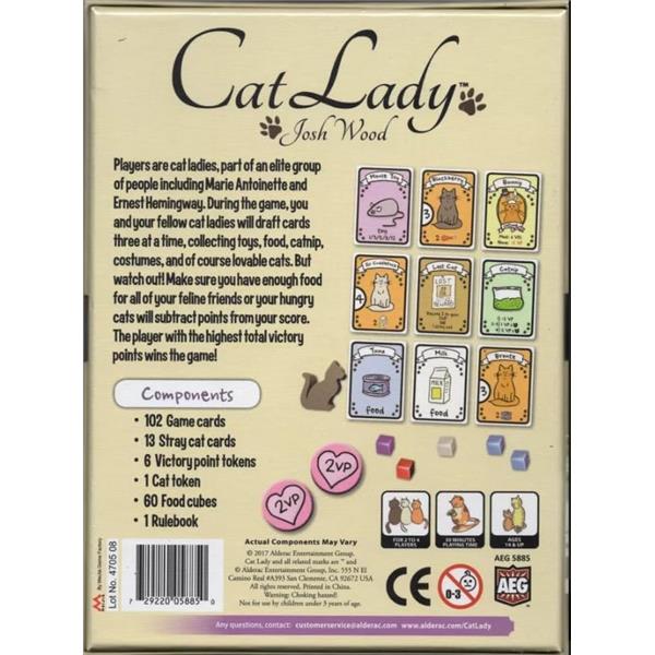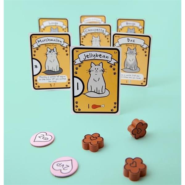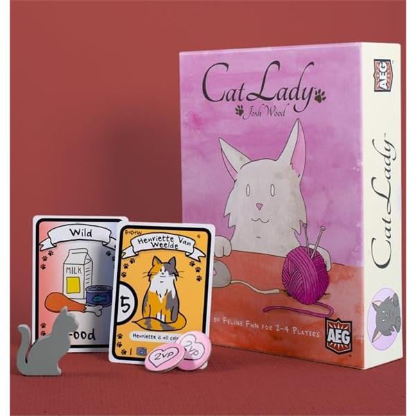 In Cat Lady, players are cat ladies, part of an elite group of people including Marie Antoinette and Ernest Hemingway. During the game, you and your fellow cat ladies will draft cards three at a time, collecting toys, food, catnip, costumes, and of course lovable cats. But watch out! Make sure you have enough food for all of your feline friends or your hungry cats will subtract points from your score. The player with the highest total victory points wins!