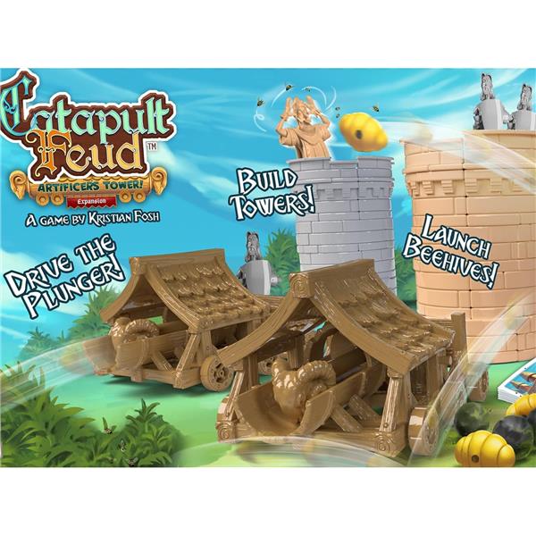 Catapult Feud: Artificer's Tower Expansion includes a new weapon (the Mighty Plunger), new Action cards, new ammunition (bee hives!!) and bricks to help you build the Artificer’s Tower!