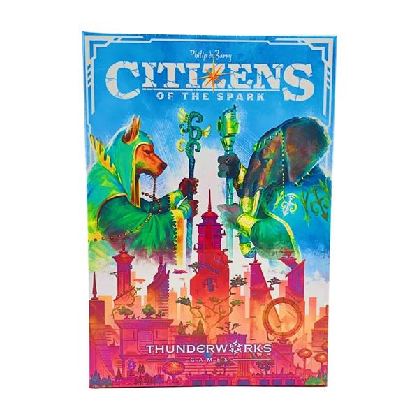 Citizens of the Spark is a variable set-up card game in which players take turns attracting citizens, taking actions, and claiming sparks. The more citizen cards a player has of a specific type, the more powerful that citizen's action becomes. The player with the most sparks in their city when the deck runs out wins!
