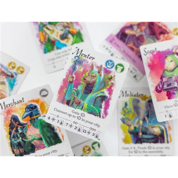 Play with 7-10 animal citizen types per game, chosen from 30 available creatures and combined into one shared deck. Every citizen type has distinct powers, making each game's action combos uniquely variable.