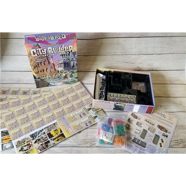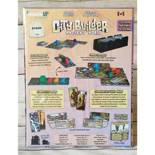 City Builder: Ancient World is a tile-laying game for 1-4 players, which can be played competitively, cooperatively or solo. Players are magistrates sent to a newly conquered province to build cities and help spread Roman influence in the area. By employing clever planning, they must grow their cities to meet the demands of incoming settlers, as well as build imposing Monuments to please their emperor.