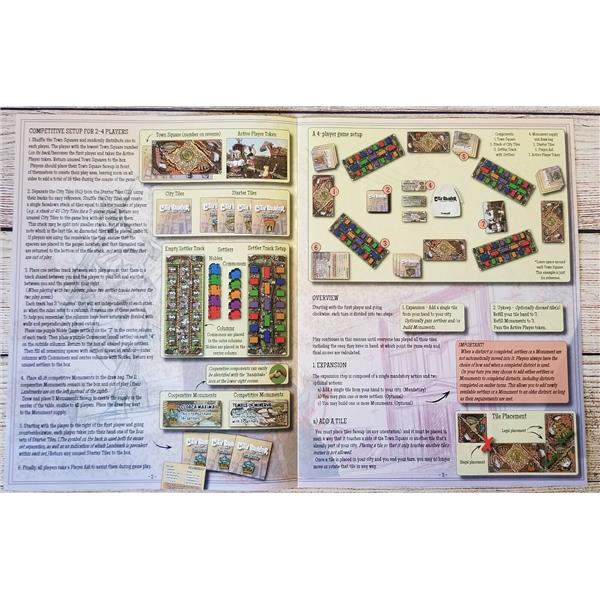 To win, players must build impressive Monuments and fill their city with incoming settlers. Monuments have unique scoring bonus that will only apply to the city they are built in, while claiming settlers unlocks the point value they are covering.