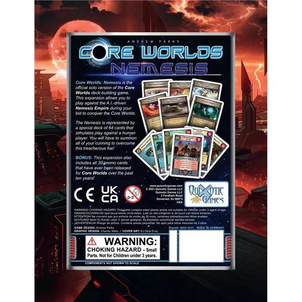 Core Worlds: Nemesis is the official solo version of the Core Worlds deck-building game. Play against the AI-driven Nemesis Empire during your bid to conquer the Core Worlds. The Nemesis is represented by a special deck of cards that simulates play against a human player, including anticipating which worlds the Nemesis is targeting in each sector and which Core Worlds the Nemesis is planning to conquer as it drafts cards throughout the game.