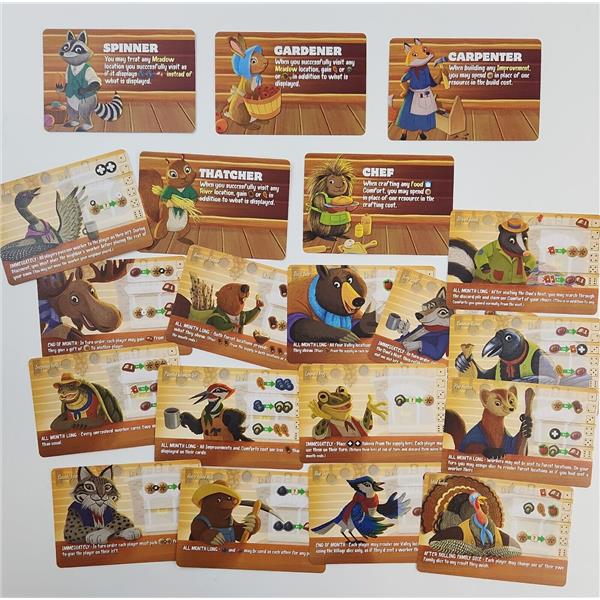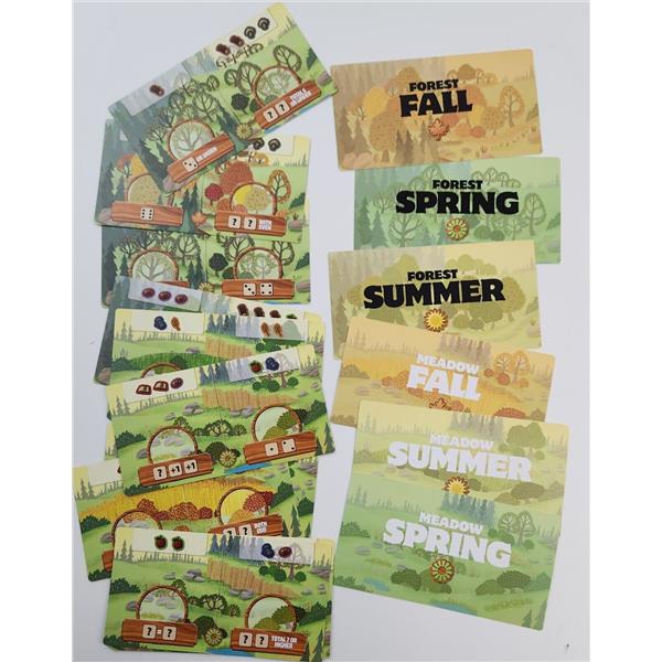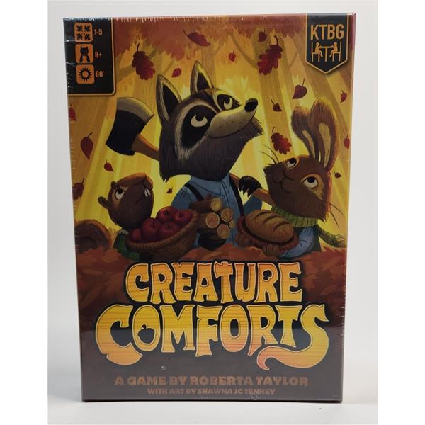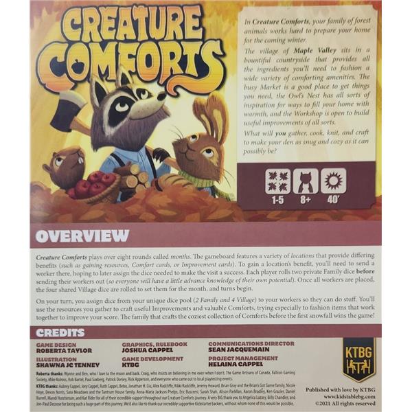 In Creature Comforts, you spend the Spring, Summer, and Fall gathering different goods from the forest and spending them to collect items that will make your home more inviting while the world outside is covered in a layer of snow. Each round you send family members out to various locations in an attempt to gain supplies. If they fall short of their goal, they’ll learn a lesson and be better prepared next time. The family that has created the most comfortable den wins the game.