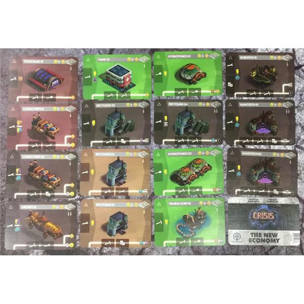 In Crisis: The New Economy these new opportunities are represented by 15 new Company cards. These are shuffled together and 5-8 of them are randomly chosen. Their equivalent replacements are then removed from the game, and Setup proceeds as in the base game.