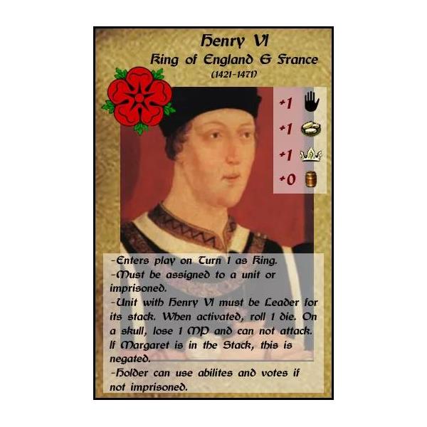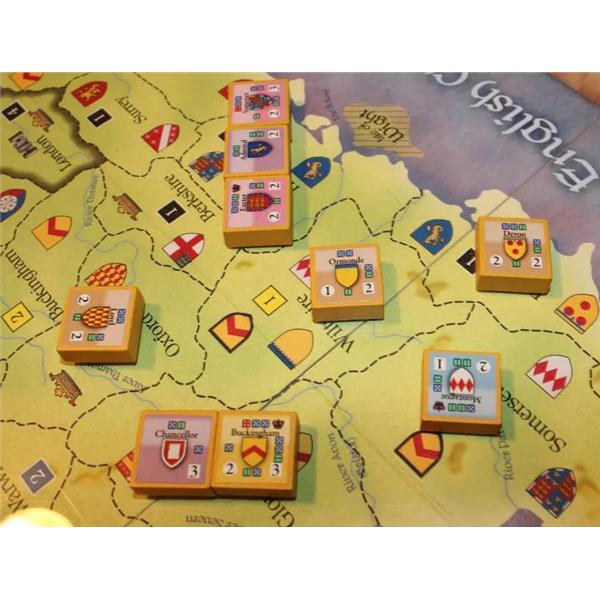 Unit blocks rotate to show strength, and each army can have a variety of experience levels and combat capabilities. A novel roll to hit-based system is used to determine combat results, with better experienced forces scoring hits more often in battle. Kill all of the enemy heirs, and you can rule England unimpeded!