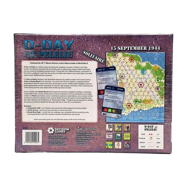 In D-Day at Peleliu, designer John Butterfield advances the solitaire system of his award-winning D-Day at Omaha Beach to the next level. You control the US forces against a Japanese defense determined to hold the island at all costs. An innovative no-dice combat system highlights unknown enemy deployments and the importance of using the right weapons and tactics. Event cards keep the action flowing and the rules simple while introducing historical detail.