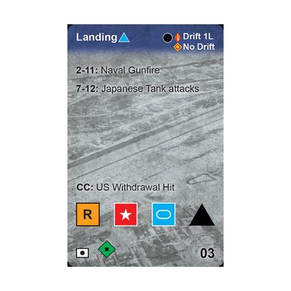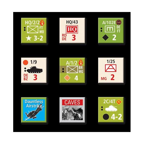 Players familiar with the previous four games in the system will be able to quickly set up and play this latest version. New features include the Japanese units seeking out gaps in the American frontline to infiltrate thus encouraging the player to maintain a continuous line. Also, Japanese tanks may attack via card driven events. These tanks may be joined by other Japanese units and conduct a special tank attack against nearby US units.