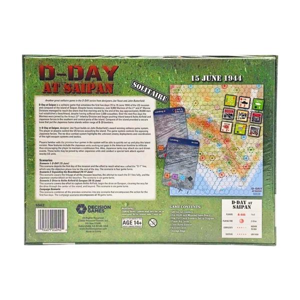In D-Day at Saipan, designer Joe Youst builds on John Butterfield’s award-winning solitaire game system. The player or players control the US forces assaulting the island. The game system controls the opposing Japanese forces. The no-dice combat system highlights the unknown enemy deployments and coordination of the right weapon systems and tactics.