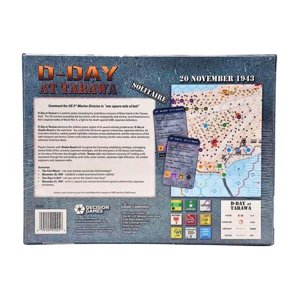 D-Day at Tarawa is a solitaire game simulating the amphibious invasion of Betio Island in the Tarawa Atoll. The US marines assaulting the tiny island, with its strategically vital airstrip, found themselves in their toughest battle of World War II, a fight to the death against 5,000 Japanese defenders.