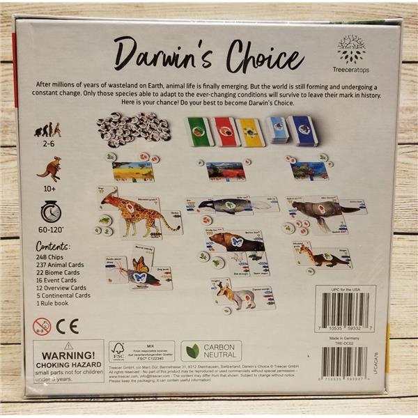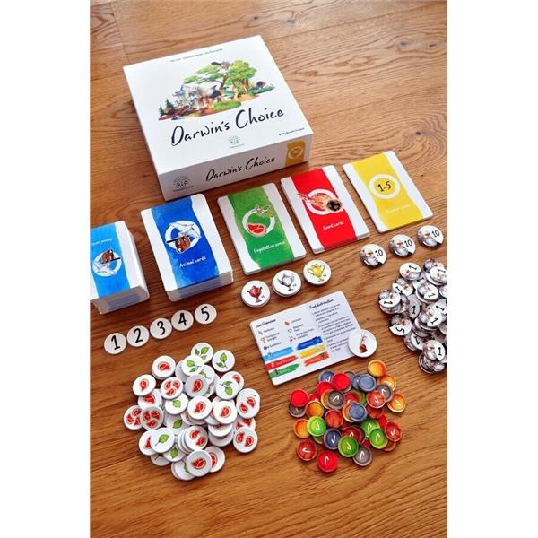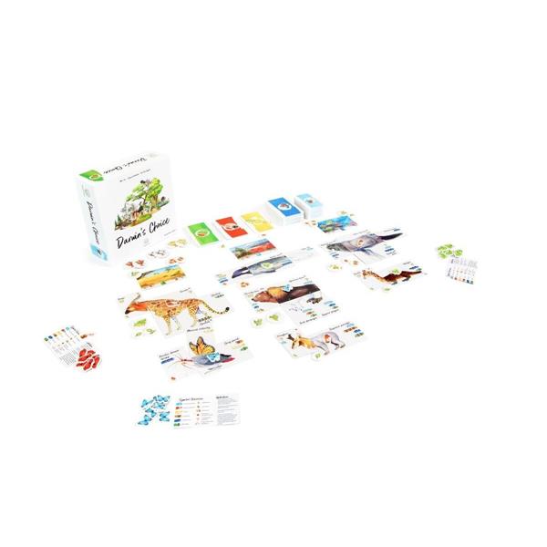 Darwin's Choice is a competitive card game in which players create their own animal species from more than 230 animal cards. These animal species will be placed in biomes that differ strongly in their requirements and the food supply. The highest possible adaptation of animal species to their biomes not only ensures their survival but is also rewarded with the coveted Darwin points. In addition to a high adaptation the species with the highest competitive strength are also awarded across all zones.