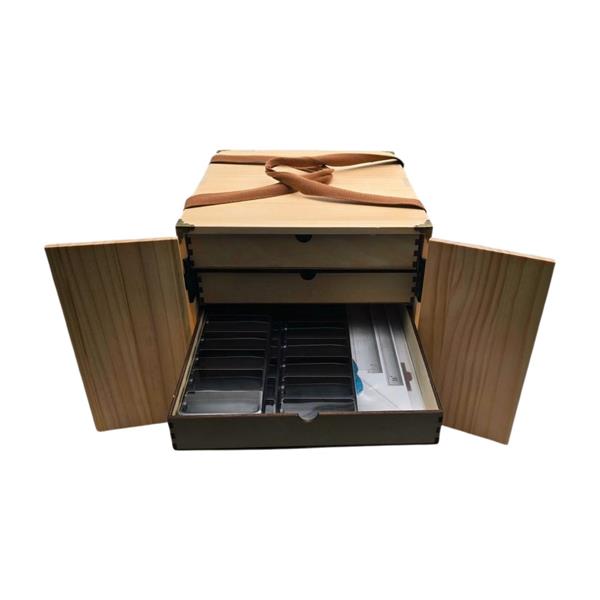 This wooden deluxe storage box is designed to hold everything you need to play the game and fit perfectly into a Kallax cube. All the components are stored in shelves for quick and easy setup. Carrying handles make it easy to transport your whole Dead Reckoning Experience!