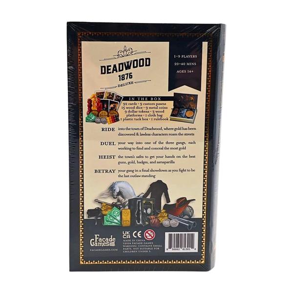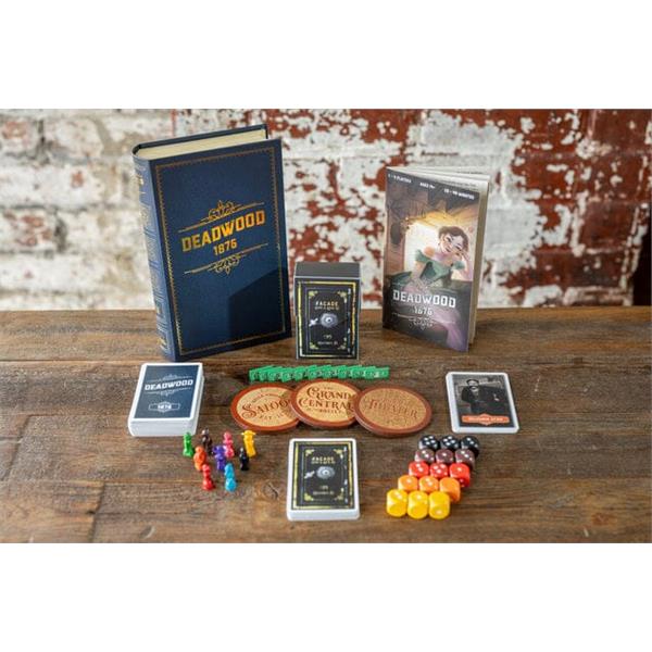In Deadwood 1876, you use cards from your hand to try to win Safes from other players. Safes contain Badges, Gold, or Showdown Guns. Near the end of the game, players with Badges get extra turns. After the final turn, the team with the most Gold will advance to the Final Showdown. There, teammates will have to fight each other to the death using Showdown Guns. The last person alive is the winner!