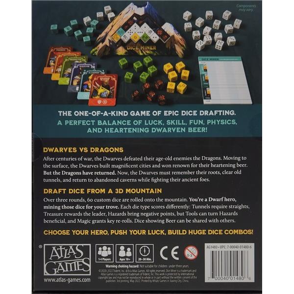 In each of three rounds, custom dice are rolled onto the mountain. You are a Dwarf hero, drafting dice for your hoard. Scores are tallied after each round before you re-roll your dice and the mountain is refilled.