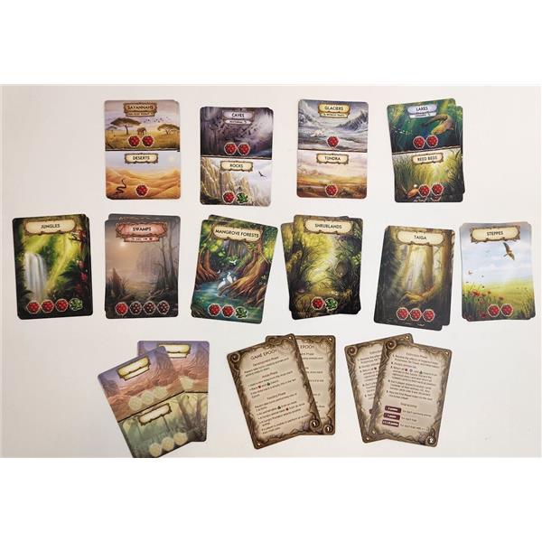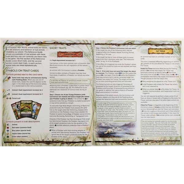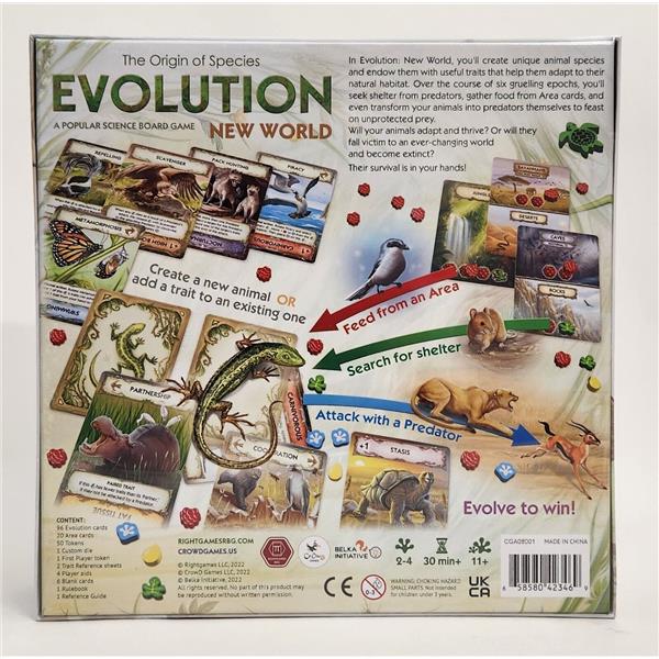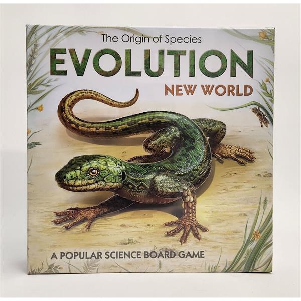Evolution. New World is an updated and extended version of the basic Evolution. The Origin of Species game. It includes both well-known animal traits and new ones, complete with refined descriptions and colorful illustrations. Food is now generated using Area cards, and animals can use shelter to hide from predators.