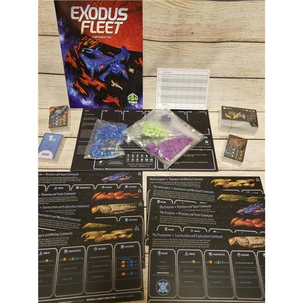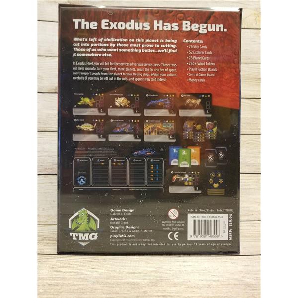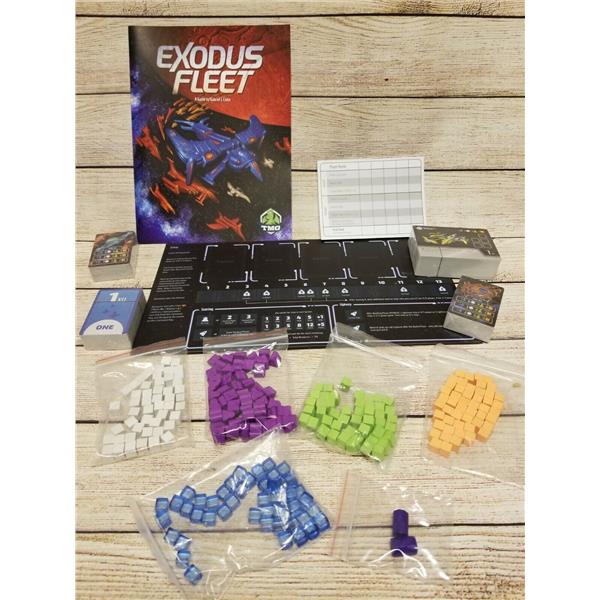 The Exodus Fleet features resource management and tableau building mechanisms along with a highly interactive system of role selection and bidding in which players compete to hire miners, spaceship builders, and other groups to piece together their own fleet to escape a dying Earth. Just building ships and filling them with refugees will score you points, but making sure your ships work together may give you the advantage you need.