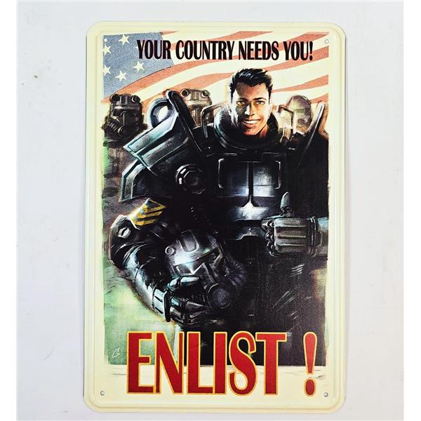 Enlist!.. Your Country Needs You. This metal sign from the dystopian world of Fallout depicts the iconic Recruitment poster. The tin sign measures 20cm x 30cm and features 4 holes in each corner to allow for easy wall mounting.