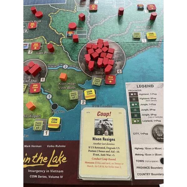 Fall of Saigon will include 79 Event, Pivotal Event, and Coup cards; about 30 Non-player cards; one sheet of counters and track tiles; about 20 added wooden pieces; new and updated player aid charts; and expansion rule and play booklets. Fire in the Lake veterans will find the war beyond Paris easy to rev up but a whole new experience.
