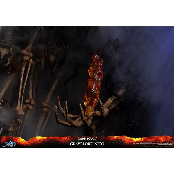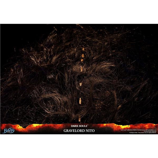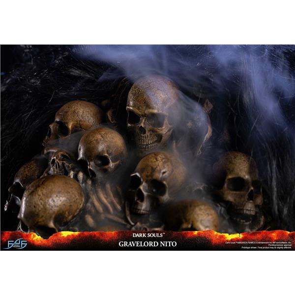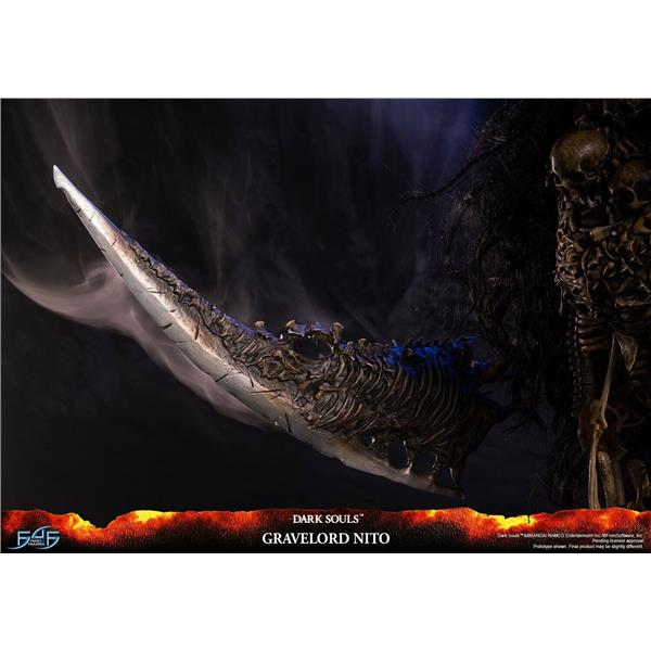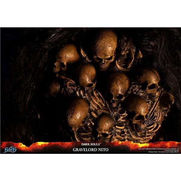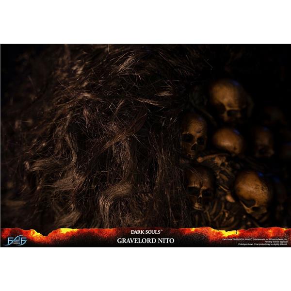 As the epitome of all things death within the Dark Souls universe, Nito's entire body is forged from the skeletons and bones of the dead, including the Gravelord Greatsword in his right arm, which isn't something he's holding but rather is a part of him. Apart from the dangling skeletons from his upper torso, which are made out of PVC, the rest of the statue and the base are made of resin. The removable faux hair cloak over Nito emulates the hair-like cloak he has in the game, which contributes to his very ominous and sinistrous aura. And lastly, as seen in the opening cinematic of the original Dark Souls game, Gravelord Nito is holding a Lord Soul, which is what he's holding in his left hand.