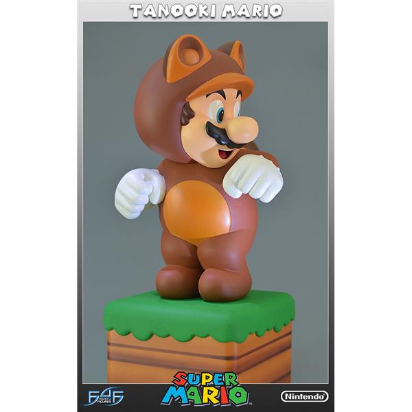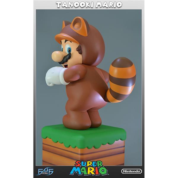 First 4 Figures is very excited to reveal Tanooki Mario from the hit-game 'Super Mario 3D Land', the first in an entirely new series of Super Mario statues. After collecting a Tanooki Leaf, Mario dons the Tanooki Suit thus granting him new abilities such as a glide and a powerful tail whip attack. We've captured him in his trademark pose from the game, shaking his tail and ready unleash the tail whip at any moment. The base that he is stood on is styled after the first world in the game with a rich green lawn atop striped brown soil.