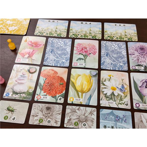 Floriferous is played over three days, which are divided into five turns. Each turn, a player moves one step through the garden. After each move, the player picks up a flower or desire card. After three days, players sum their scores for their desires, mastery, and points earned during the game. The player with the most points wins.