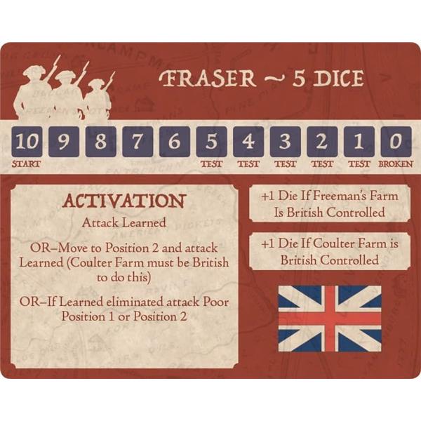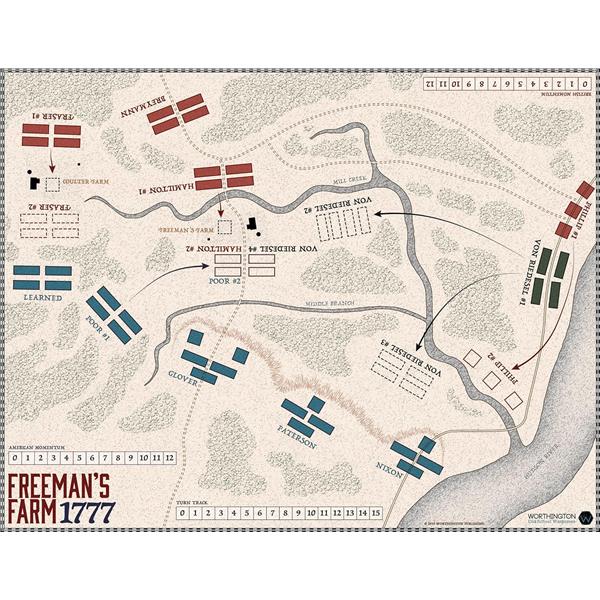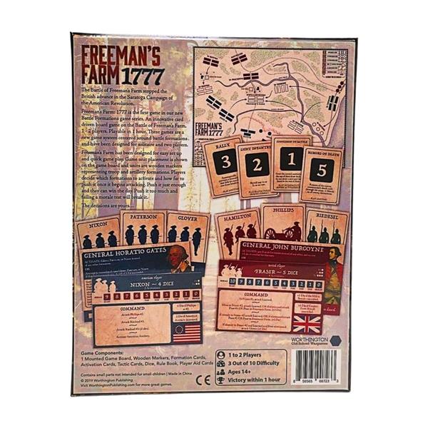Freeman's Farm has been designed for easy set up and quick game play. Game unit placement is shown on the game board and units are wooden markers representing troop and artillery formations. The game was developed for solitaire play AND for two players. In solitaire mode players can play as either the American or the British against the solitaire player game engine.