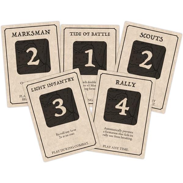 Each formation has a fixed number of troop markers that can be hit in combat and are also subject to breaking from morale loss. Each formation can only be activated when its activation card is played, and these are limited and not always available. Each formation reduces its morale when activated and when continuing attacks.