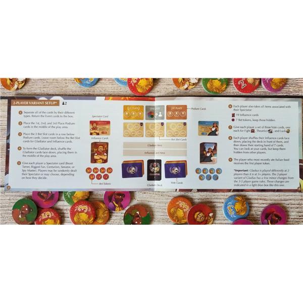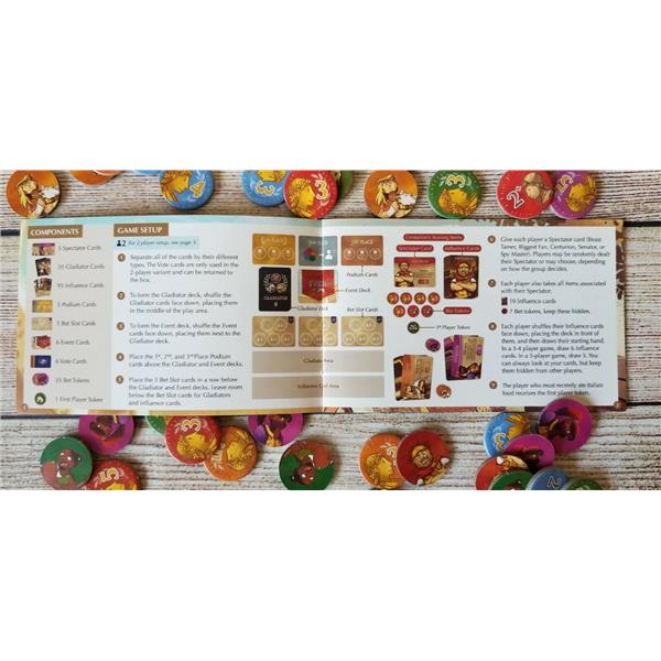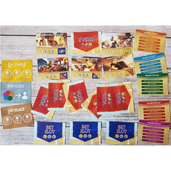 Draw a random event card to determine how many gladiators will compete and what skill(s) the event is judged on. Each gladiator has varying levels of Fight ?? , Theatrics ?, and Luck ? that can be buffed or nerfed throughout the game.