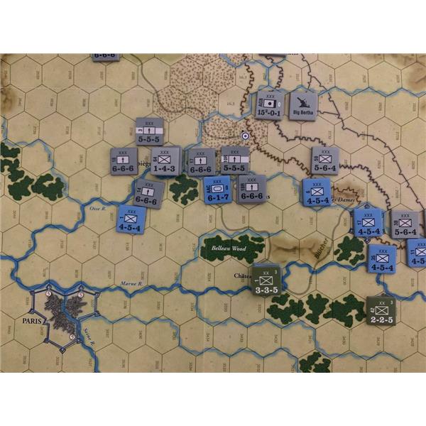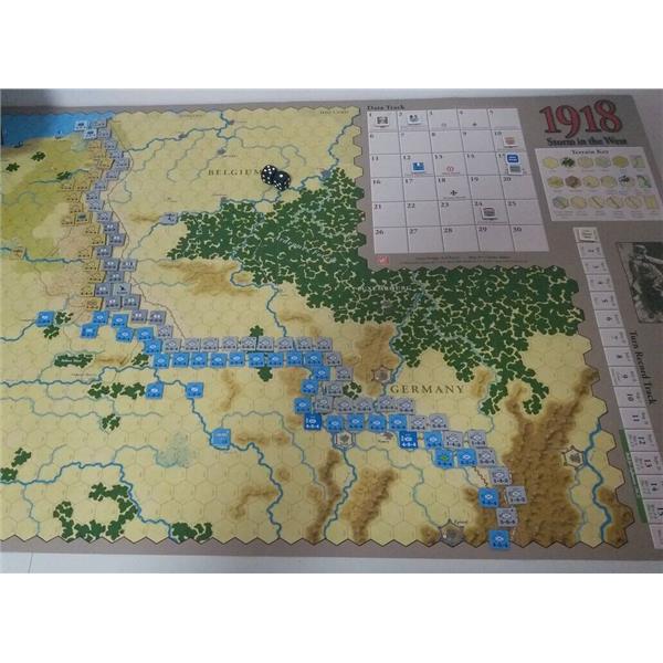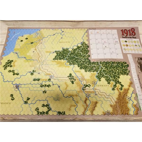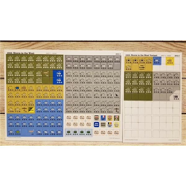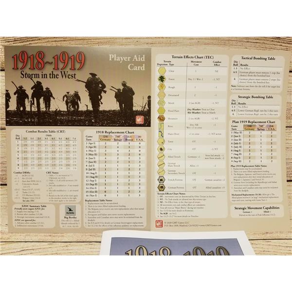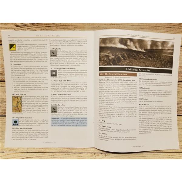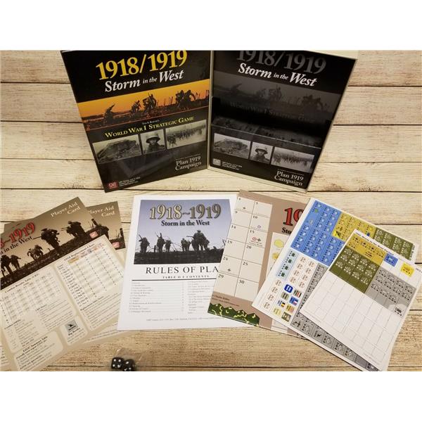 This new GMT boxed version of 1918/19: Storm in the West is a two-player system that also works fine for solo play. Units are mostly corps (divisions for the USA, whose oversized units were nearly the size of Allied corps), and include infantry, tanks, cavalry and air support. The Germans start the 1918 campaign with large numbers of Stosstruppen, trained to overcome the trench stalemate of the previous three years. This gives the German player a strong offensive capability in the first half of the game. But these "shock troops" are a wasting asset, and if the Allies survive the initial blows, growing numbers of US troops and Allied tanks will see the Germans forced into a desperate defense in the game's second half.
