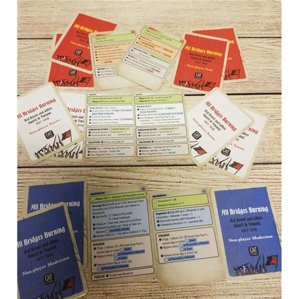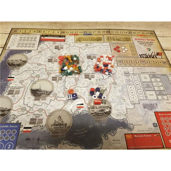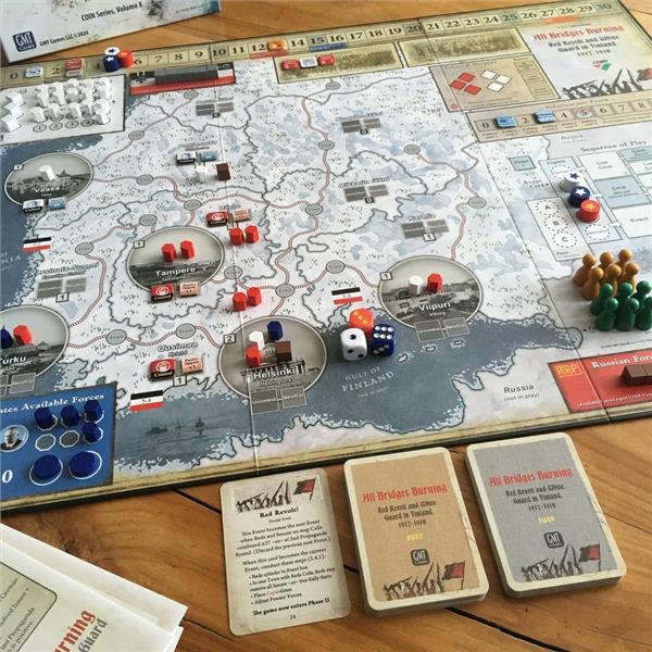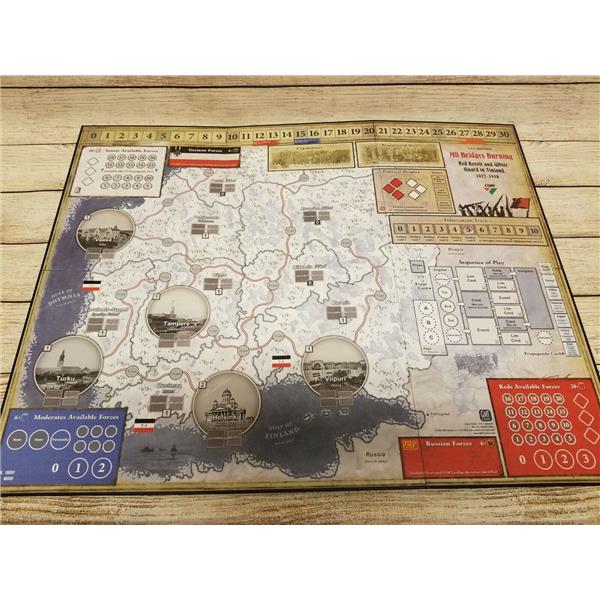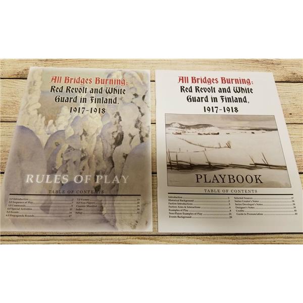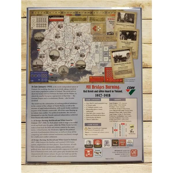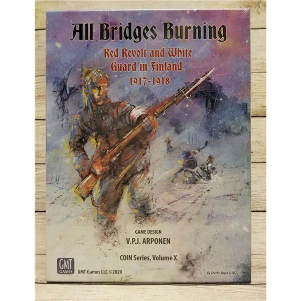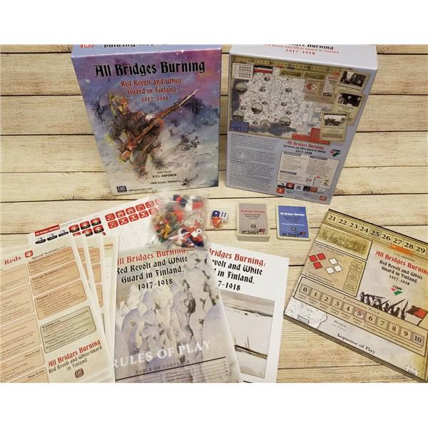 All Bridges Burning recreates the political and military affairs of the Finnish civil war in a new COIN System volume for three players. The Reds seek to stage a working class revolt and then hold on to their gains, while the White Senate forces seek to reassert control. A third, non-violent Moderates faction fights for the survival of parliamentary democracy and political reform. All three factions must keep the national sentiment conciliatory enough for a post-conflict settlement and national independence. In addition, the non-player powers of Germany and Russia offer military assistance to the Senate and the Reds, respectively. Excessive foreign involvement, however, could quash the dream of Finnish independence and prompt a collective loss of all three player factions. Historical events, asymmetrical action menus, as well as extensive historical design notes familiarize the players with the historical period.