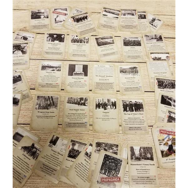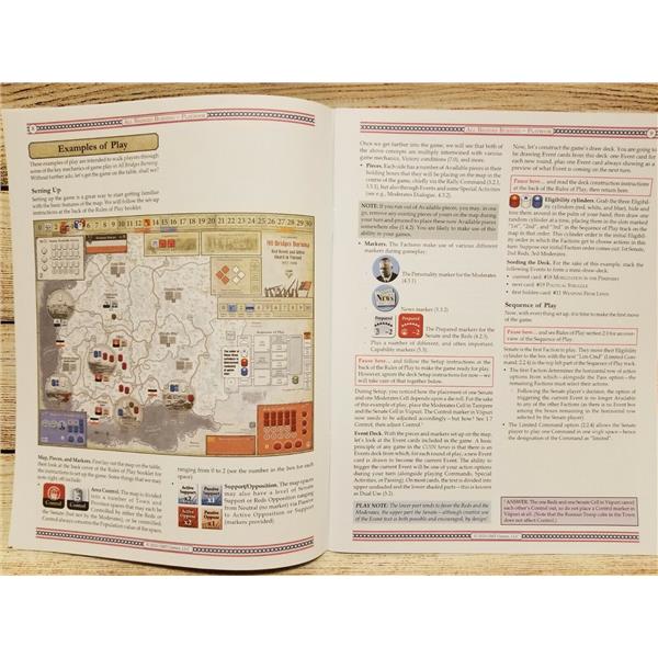 A unique sequence of play for three factions poses players - whether veteran or new to the COIN Series - fresh challenges in selecting from the asymmetric commands and special activities. The Reds will find themselves needing to split time and resources between competing tasks of solidifying the Red revolt by creating working organs of civilian administration on the one hand, and fighting an increasingly desperate war against a far more powerful enemy on the other. The White Senate faction, in contrast, has a more traditional war to fight. The Senate will want to enhance their military performance by capabilities such as armored trains, cannons, as well as the Finnish, German-trained 27th Jaeger Battalion. Meanwhile the Moderates will be focused on building and maintaining underground networks of information, distributing news across the fronts, and advancing a stagnating political process while fending off retributions from the two warring factions.