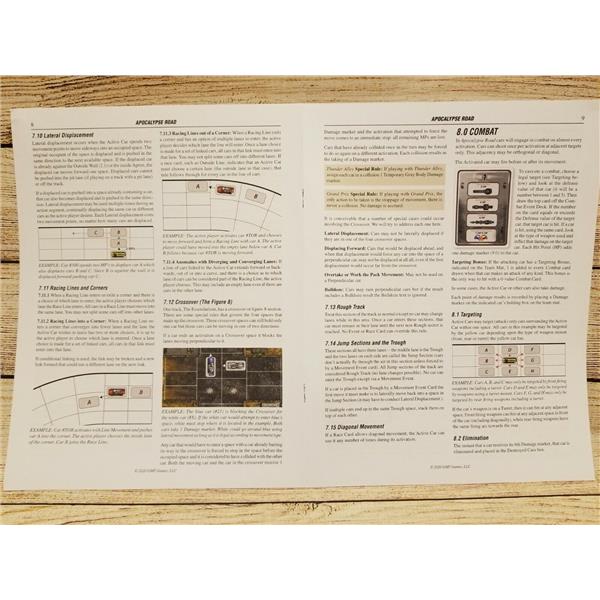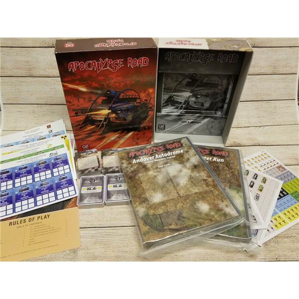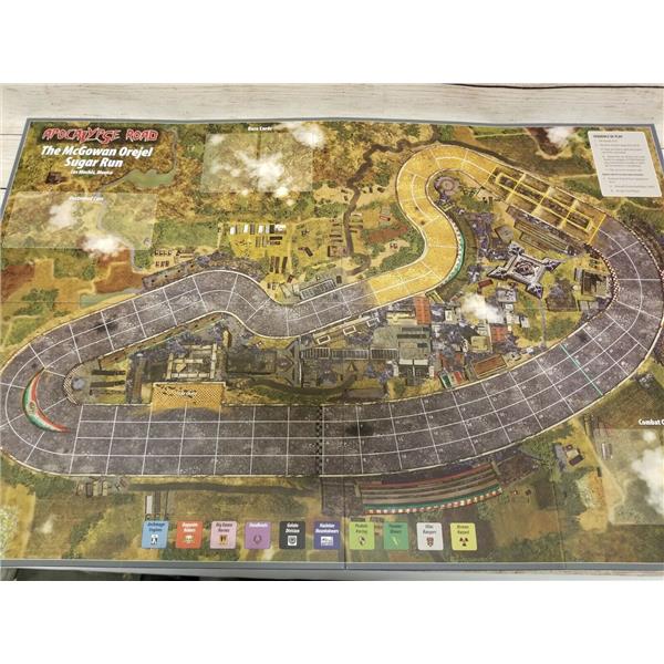 Apocalypse Road is a race game using the Thunder Alley/Grand Prix engine. Players attempt to score points by crossing the finish line (somewhat like roller derby) and by eliminating opposing cars. The first team to 15 points wins the event and gets a double portion of foodstuffs as a reward.