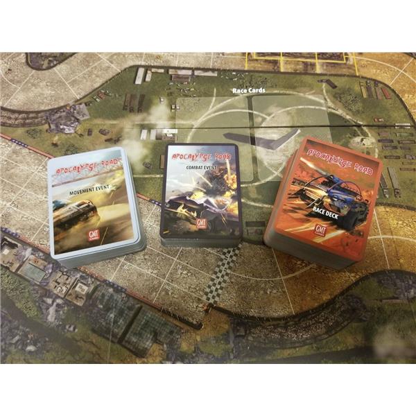 There is no specific events phase in Apocalypse Road. Instead players control their risk and rewards. When a player attempts to damage another car, a Combat Results card is drawn to resolve that combat. If a player uses one of the most effective Race Cards, they require a draw from the Movement Event deck. These events could be good or bad and are often situational, depending on the car's position on the track and the type of terrain it is passing through.