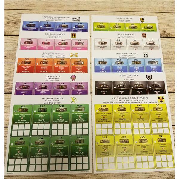 Each team consists of 5 cars and 3 alternates. Each time a car is eliminated it is removed from play. On the next turn players that have lost cars may replace cars with alternates out of "The Chute."