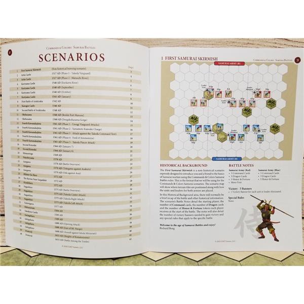 The Commands & Colors: Samurai Battles game rules allow players to portray important engagements of Japanese history. The battles, included in the scenario booklet, focus on the historical deployment of forces and important terrain features in scale with the game system. The scale of the game is flexible and varies from battle to battle. For some scenarios, an infantry unit may represent an entire clan of soldiers, while in other scenarios a unit may represent just a few brave warriors.