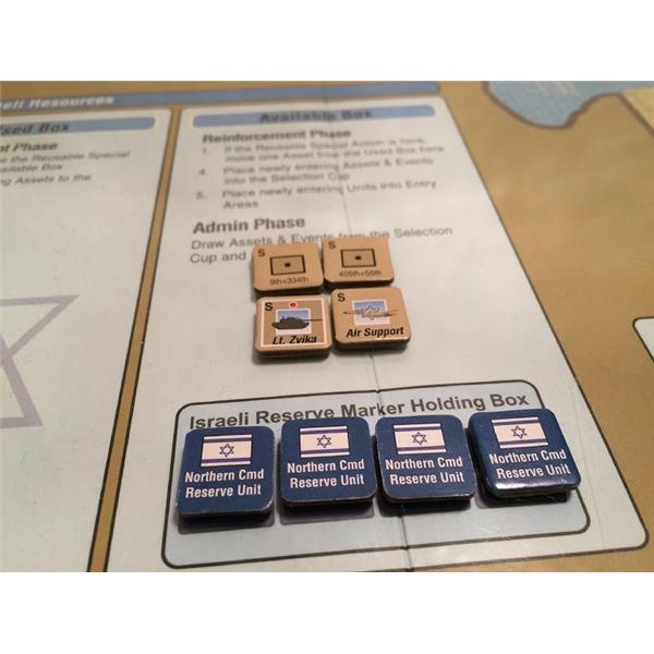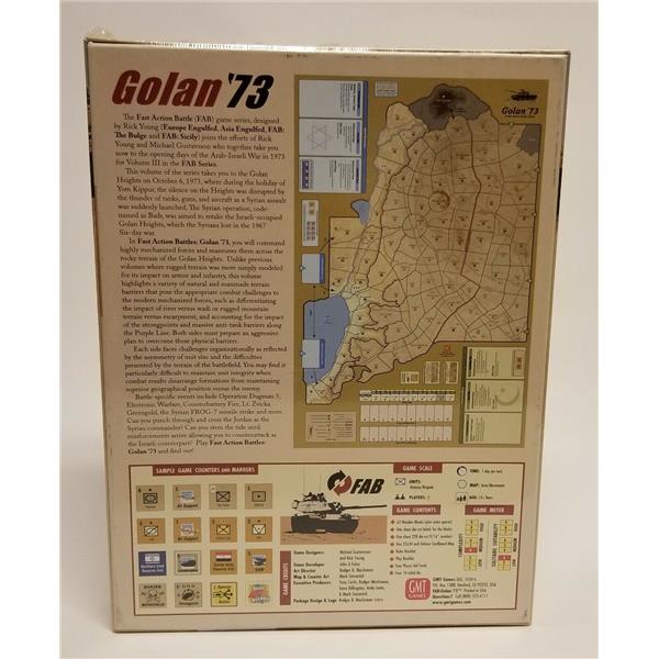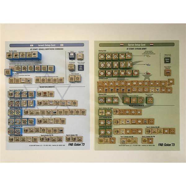 The Israelis start with few units but gain strength as reinforcements arrive, but will there be enough and will they get there in time? The Syrian player starts with a very strong force, but must attack at the right places and rely on rapid breakthrough across the Golan Heights in order to seize the objectives. Time is against the Syrians, with not only the Israeli reserves arriving, but also as the SAM barrier gets reduced and the effectiveness of the Israeli Air Force grows. The Syrians must strike hard and fast, then fight to hold on to their gains.