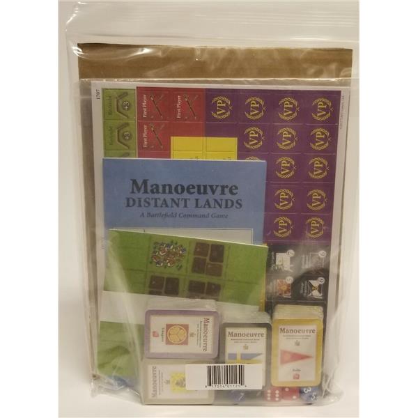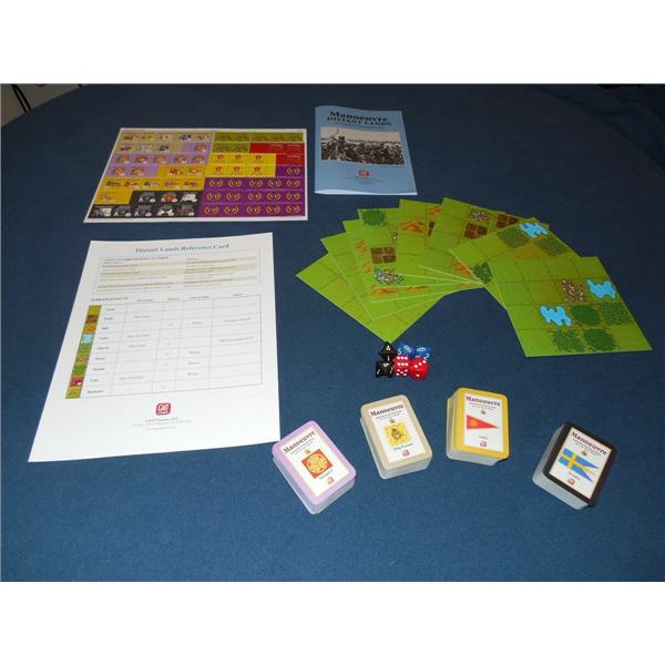 Manoeuvre: Distant Lands is an expansion for Manoeuvre. Four new armies are included to allow you to bring the fight from the frozen north to the sub-continent and the mythic east. Included in this set are counters and cards for Sweden, the splintered Kingdoms of India, the Chinese 8-Banner Army and the crumbling remains of the Japanese Shogunate. Also included is a set of 8 new land tiles that will force veteran players to learn new tactics among the swamps and fields of the Orient as well as the forests of Scandanavia.