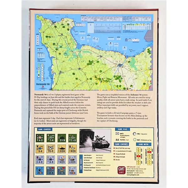 Normandy '44 is a 2, 3, or 4-player regimental level game of the D-Day landings on June 6th and the battles that raged in Normandy for the next 21 days. During this crucial period, the Germans had their only chance to push back the Allied invasion before the preponderance of Allied men and material made the outcome certain. During this period, the U.S. 1st Army fought across the Cotentin Peninsula and captured the major port of Cherbourg while British forces took on the bulk of of the German panzer divisions near Caen.