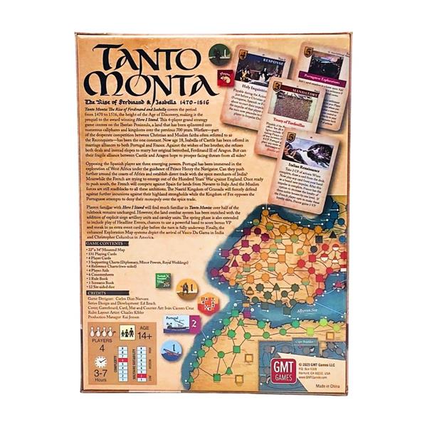 New Features: Tanto Monta introduces several innovations to the game series. The land combat system is enriched with the addition of explicit siege artillery units and cavalry units for all major powers, which can try to turn the tide in battle by making a dedicated cavalry charge. The spring phase is also extended to include play of Headline Events, chances to use a powerful hand to score bonus VP and sneak in an extra event card play before the turn is fully underway. Finally, the enhanced Exploration Map systems depict the arrival of Vasco Da Gama in India and Christopher Columbus in America and include explicit rolls to try and navigate into the Terra Incognita.