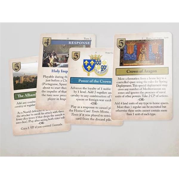 Basic Flow: Retaining many of the game systems from Here I Stand and Virgin Queen, turns start with each player being dealt a hand of cards from the shared deck to supplement their Home Cards (which provide unique actions for each major and secondary power). After diplomatic negotiations and spring preparations have concluded, players play these cards as events or operations to conduct military, political, or exploration actions to maximize their victory point gains. At the end of each turn, armies winter, royal marriages take place, and—unless there is a winner—the game resets in preparation for the start of the next turn.