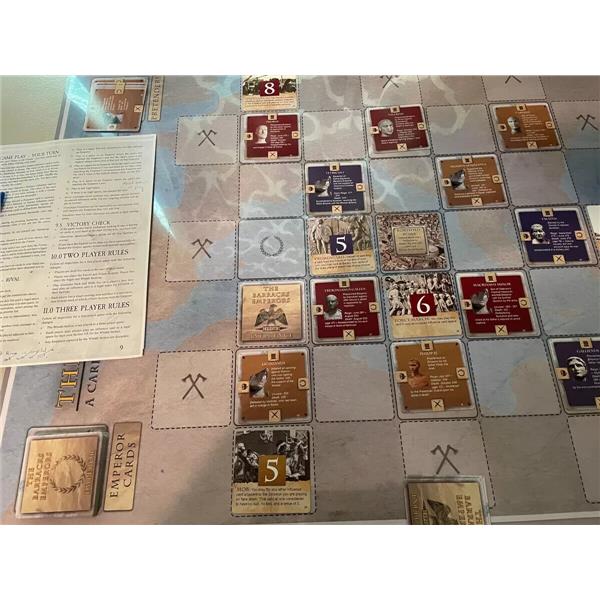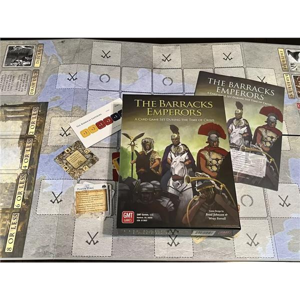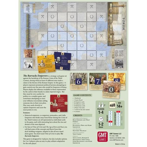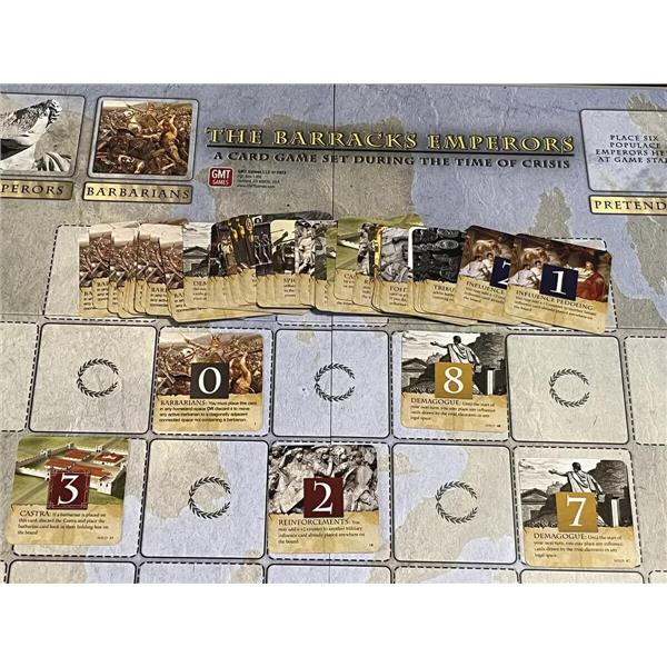 The Barracks Emperors is a strategy card game set against the backdrop of the Roman Crisis of the Third Century, during which at least 45 different men made a claim to the throne of the Roman Empire. In this game, 1-4 players represent prominent political factions attempting to gain control over the men who would be Emperors of Rome. Players deploy the influence available to them (represented by the cards in their hands) to claim imperial reigns (represented by the historical Emperor cards arrayed on the board.) But they must be very careful, because politics is a complex game, and sometimes attempting to exert your influence necessitates aiding someone else in their own plots. Play your cards cleverly to capture Emperors and score the most points to win.