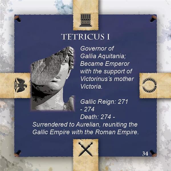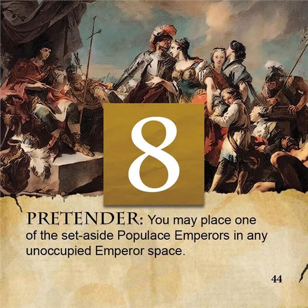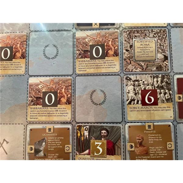 Historical emperors, co-emperors, pretenders, and even Gallic Emperors who broke away from Rome during the Crisis of the Third Century are all represented as individual cards in the game, each with interesting facts about the rise and demise of the man depicted.